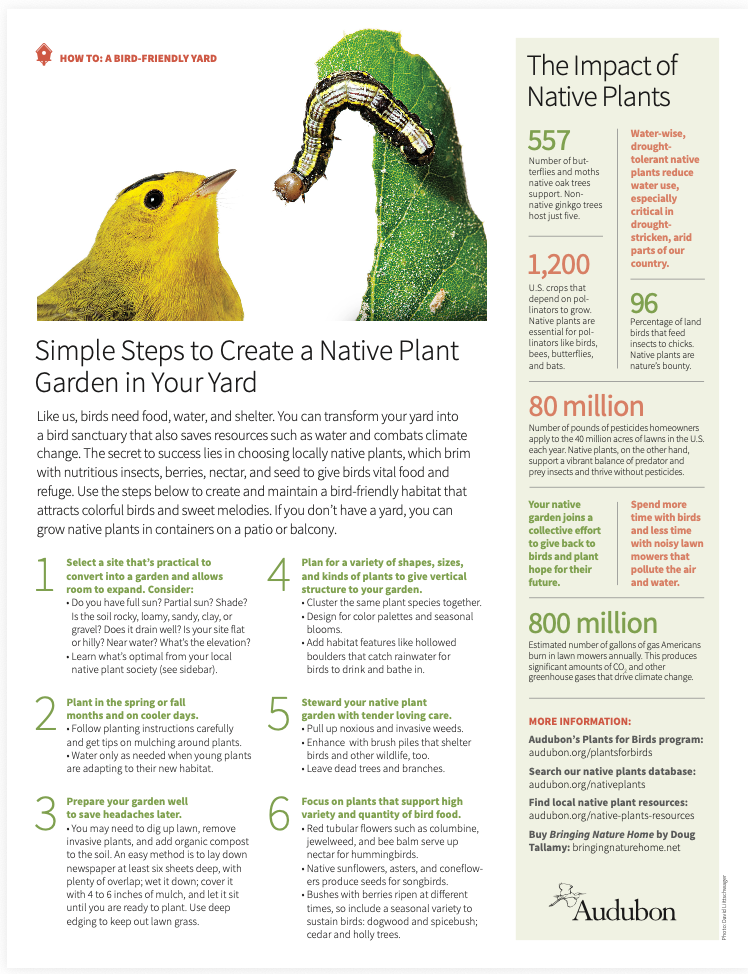 Bring birds to your home by growing native plants. With Audubon’s Native Plant Database, you can find the best plants for the birds in your area. Growing bird-friendly plants will attract and protect the birds you love while making your space beautiful, easy to care for, and better for the environment. Explore all of our native plant resources here, including our factsheets on creating a native plant garden and how it can save you money.